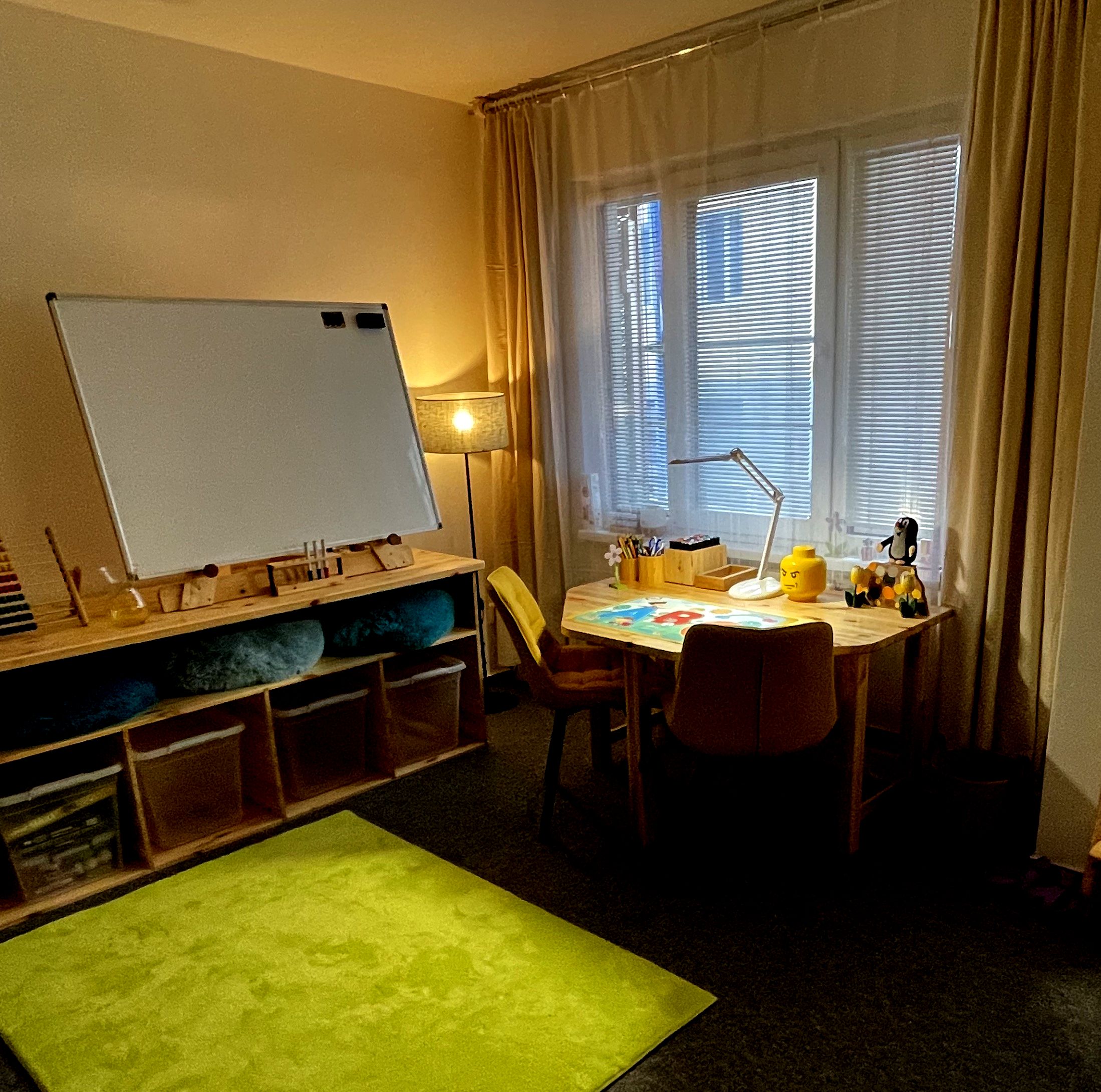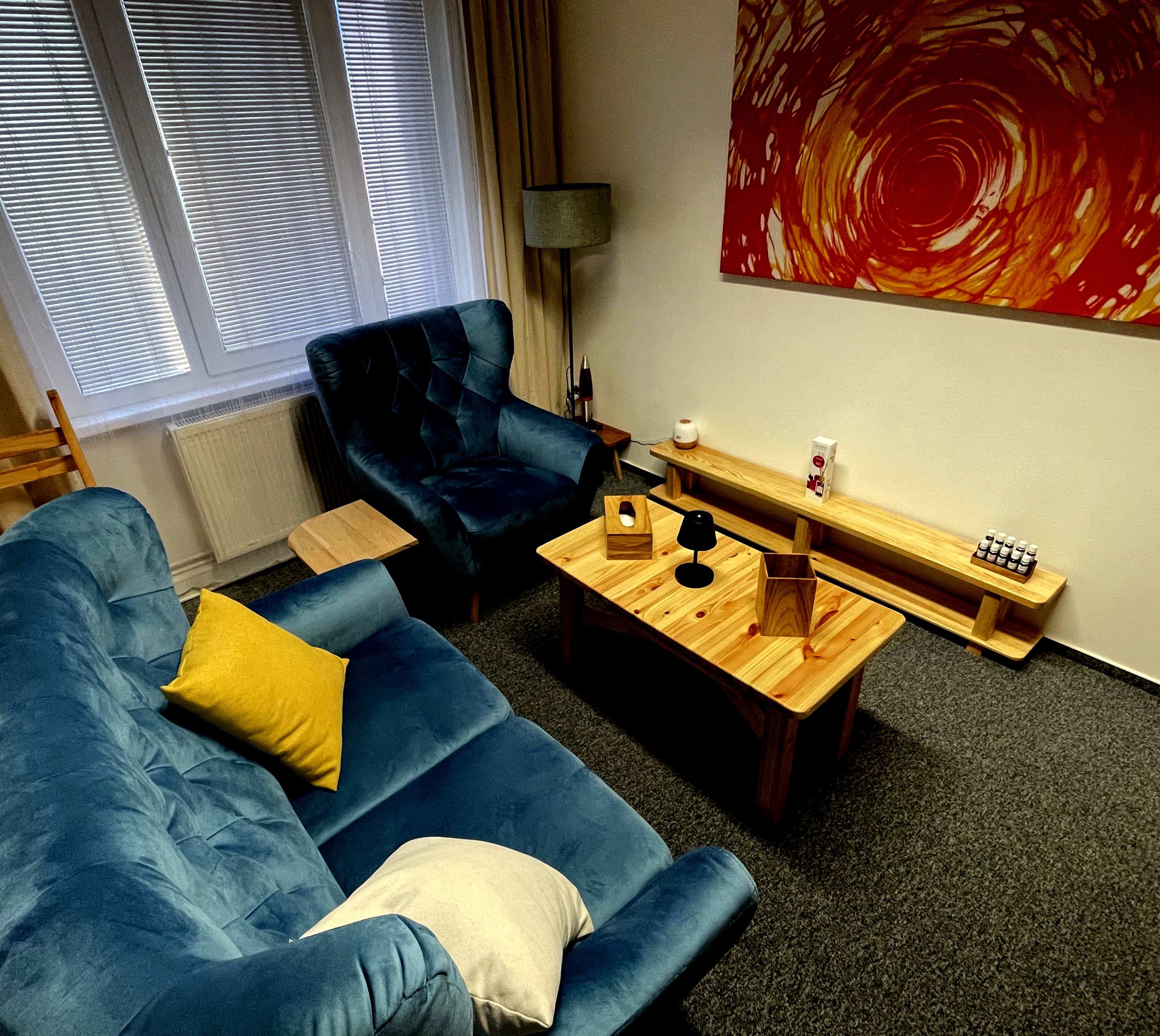 Naše poradna nabízí útulné útočiště s tlumenými světly, na míru vyráběným masivním borovicovým nábytkem, který slouží specifickým potřebám poradny.